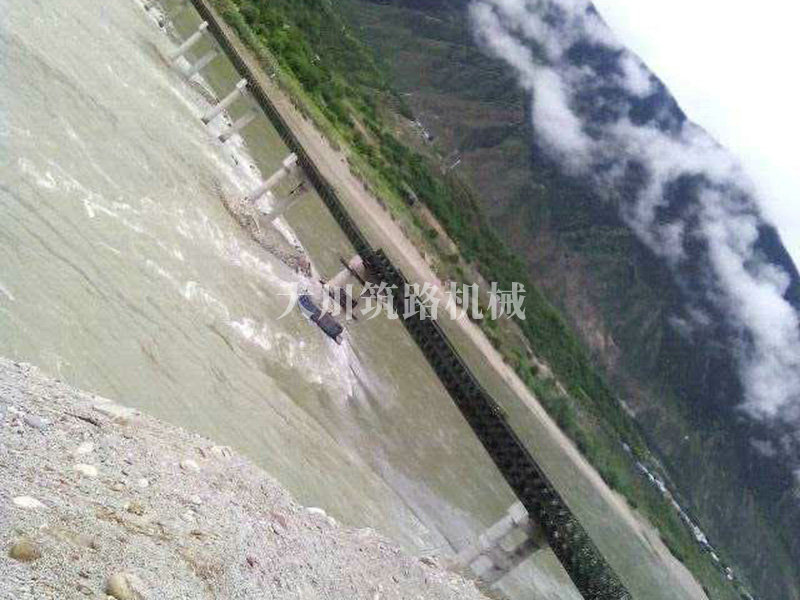 特點:本鋼橋拉薩到林芝鐵路控制性工程的重要組成部分,滿足荷載80T施工車輛通行。主河道水流急,橋墩高,經多方多次論證和設計,最后采用了24+24+24+42+42+24M三排雙層單層混合型加強型雙橫梁下承式鋼橋。克服了施工難度大、氧氣較稀薄等因難因素,采用推出法安裝,于2015年6月通車。